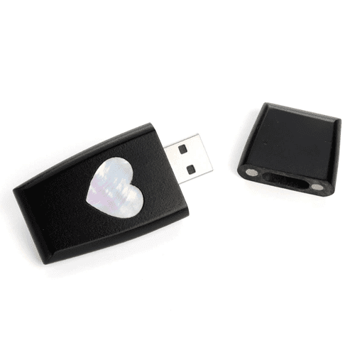 We laser engrave our USB Flash Drive in heart shape. Then fill it with a thin layer of Mother of Pearl, adding more color to the drive.